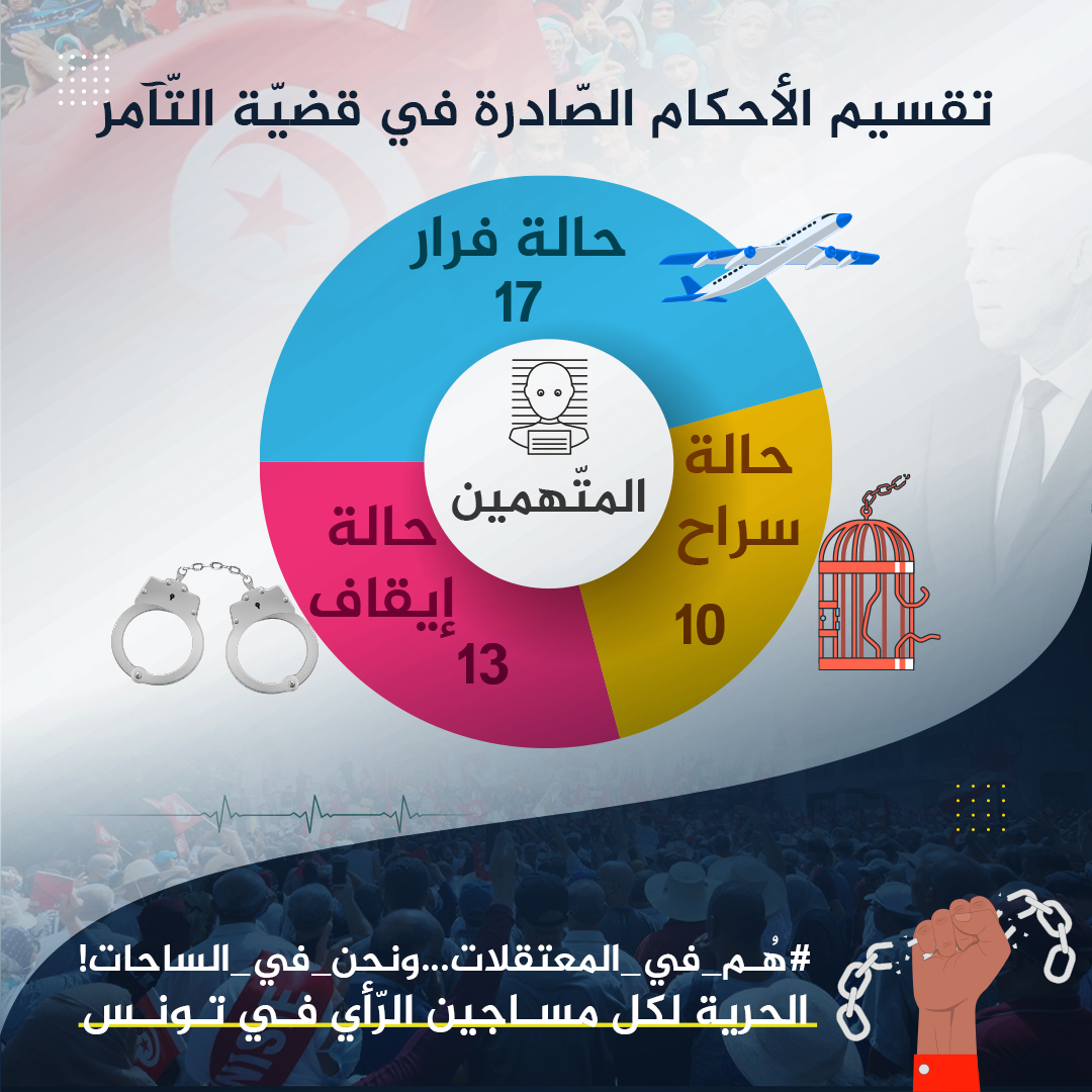 - تعتبر أنّ الأحكام العبثية والمشدّدة ضدّ رموز الحركة الديمقراطيّة في تونس وسام شرف على صدورهم ولائحة اتهام بالتآمر ضدّ سلطة سعيّد الفاشيّة والمتآمرة على التجربة الديمقراطيّة في تونس.