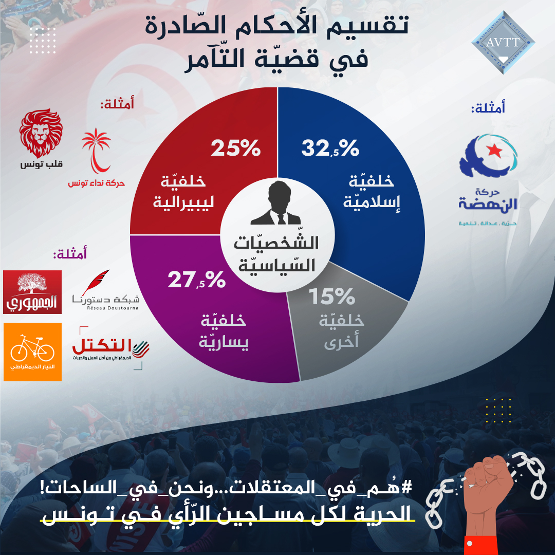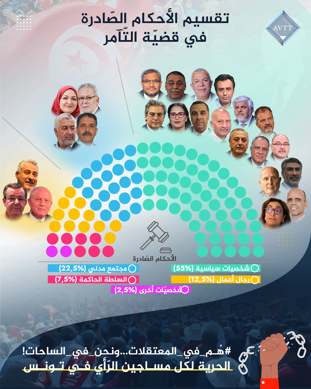 أصدرت المحكمة الابتدائية بالعاصمة تونس فجر يوم أمس 19 أفريل-نيسان 2025، أحكاما سجنيّة مشدّدة و قاسية في حقّ أكثر من ثلاثين سياسيّا من الصفّ الأوّل للمعارضة الديمقراطيّة، إسلاميين ويساريين وليبراليين، في ما يسمّى بقضيّة “التّآمر على أمن الدّولة” والتي انطلقت الأبحاث والإيقافات بشأنها منذ شهر فيفري-فبراير 2023. وقد شملت الأحكام قيادات من جبهة الخلاص الوطني ورئيسها وقيادات من الصفّ الأوّل لحركة النهضة و وزراء سابقين وأمناء عامين لأحزاب سياسية وشخصيات حقوقية مرموقة، عرفت بنضالها السلمي طيلة العقود الأربعة الأخيرة.
